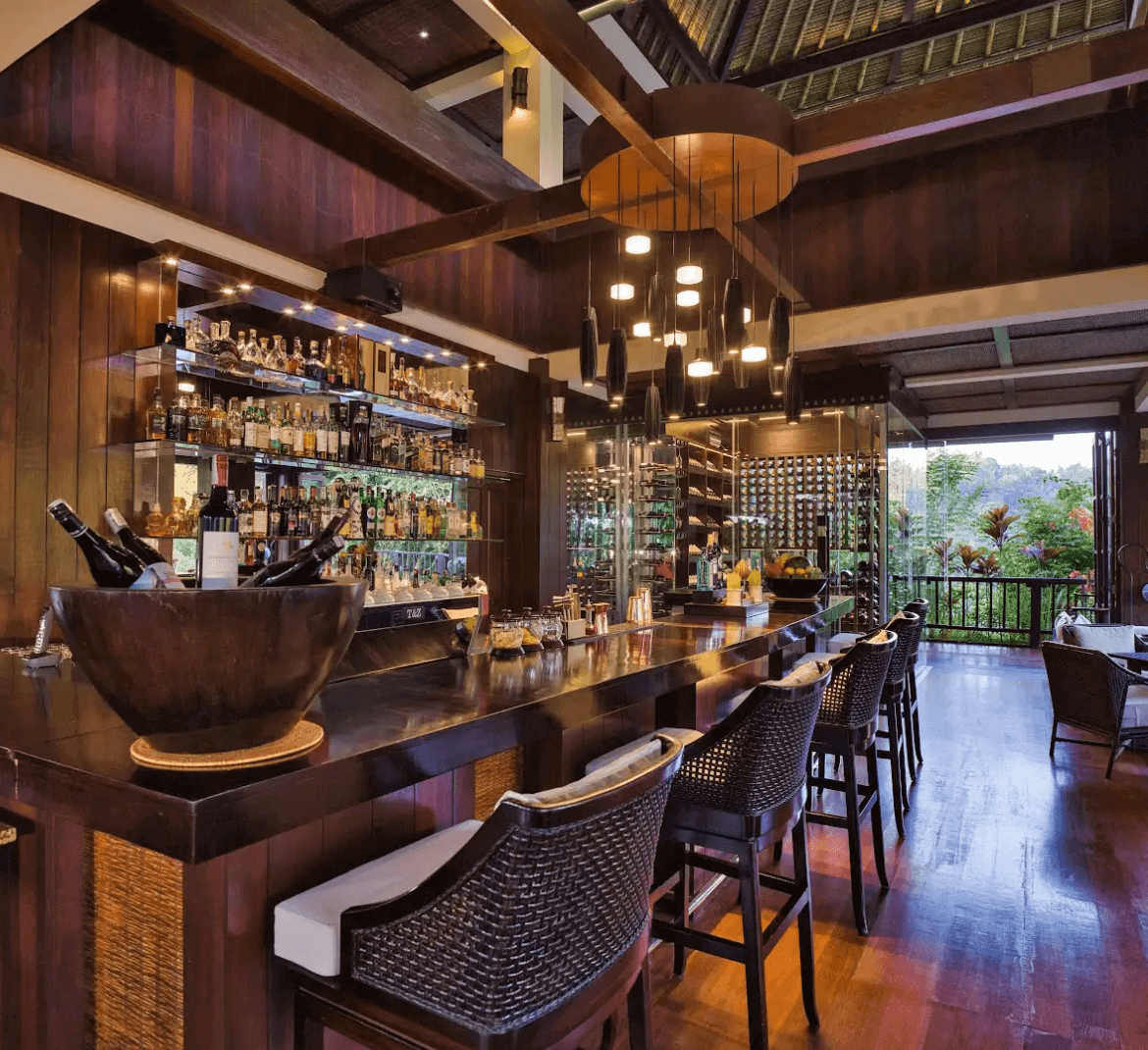 Nestled high in the lush jungle canopy of Ubud, Three Elements Bar by Hanging Gardens of Bali provides a serene and sophisticated retreat far removed from the busy town below. Overlooking the iconic twin-tiered infinity pools and framed by verdant rainforest views, the open-air bar transforms into a magical setting as dusk falls and soft candlelight fills the space.